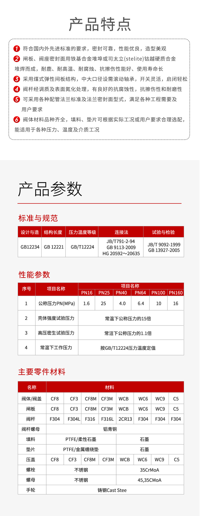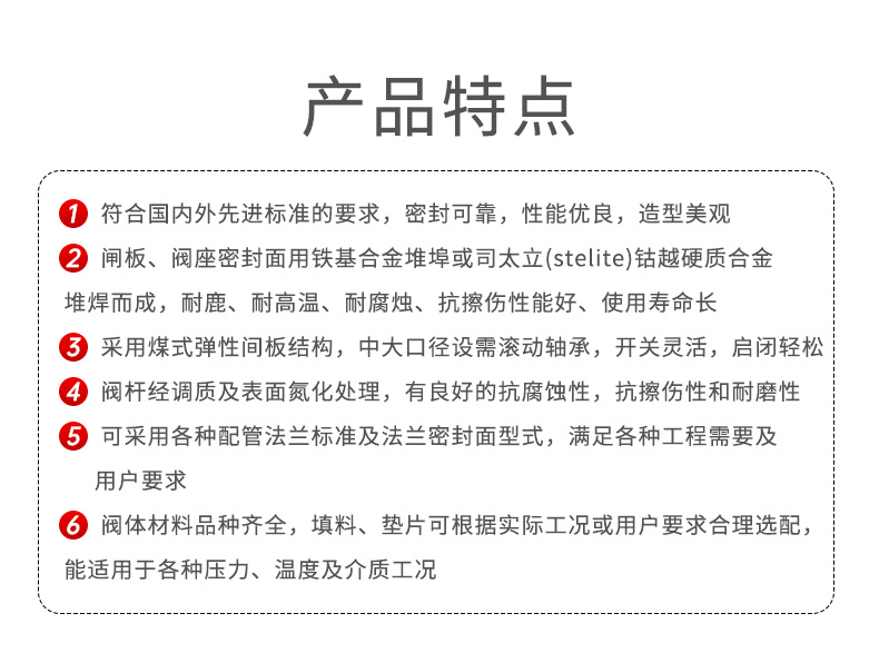 符合国内外先进标准的要求,密封可靠,性能优良,造型美观;闸板、阀座密封面用铁基合金堆埠或司太立(stelite)钴越硬质合金堆焊而成,耐鹿、耐高温、耐腐烛、抗擦伤性能好、使用寿命长;采用煤式弹性间板结构,中大口径设需滚动轴承,开关灵活,启闭轻松阀杆经调质及表面氮化处理,有良好的抗腐蚀性,抗擦伤性和耐磨性;可采用各种配管法兰标准及法兰密封面型式,满足各种工程需要及 用户要求;阀体材料品种齐全,填料、垫片可根据实际工况或用户要求合理选配能适用于各种压力、温度及介质工况